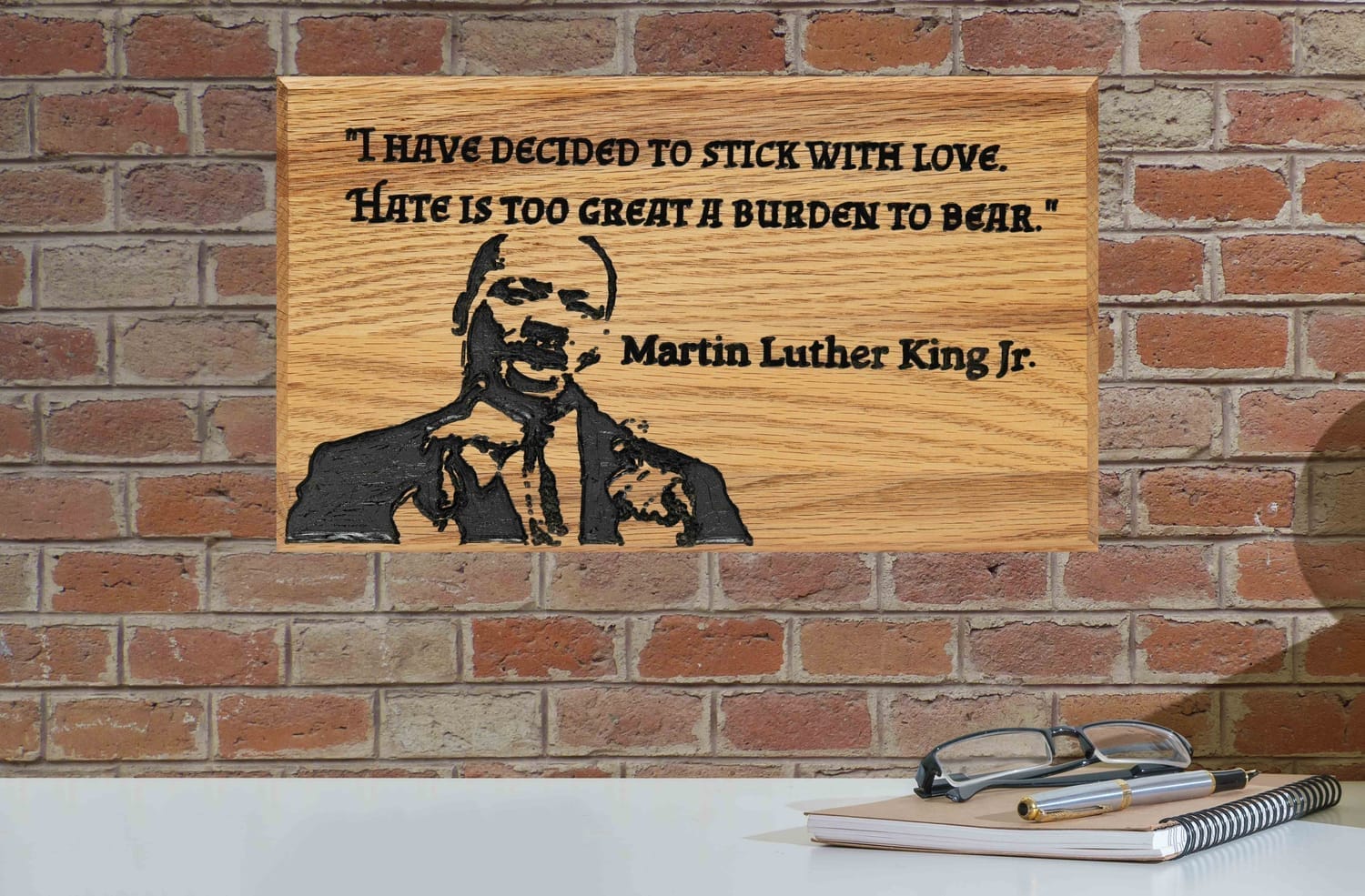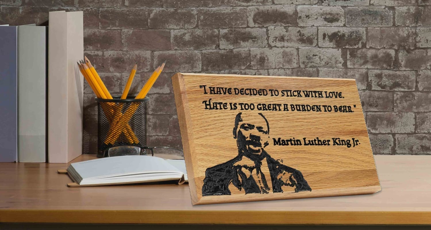 Own a piece of history that reminds the world that love always wins. Engraved in rich oak, featuring Dr. King's powerful words: "I have decided to stick with Love. Hate is too great a burden to bear."